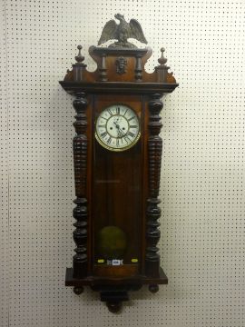 A 19th Century Gustav Becker walnut cased Vienna type regulator, twin weight with painted enamel dial, carved pediment with turned finials and eagle adornment, 129 cms high