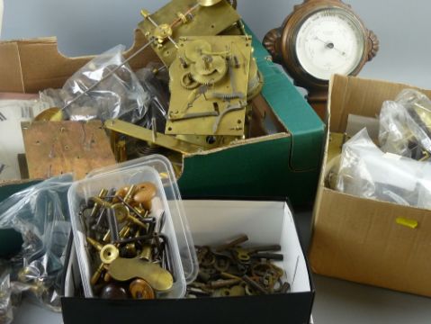A large quantity of clockmaker/restoration spares and parts including movements, dials, bezels, weights, pendulums, fittings, chains, winders, gut chord, barometers for restoration and parts and a five drawer cabinet of steel springs etc etc etc