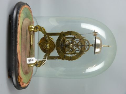 An all brass skeleton clock of neat proportions on four ball supports and having a single fusee movement striking on a bell, the dial bearing the name Edward Brown, 29 Market Street, Manchester, on an oblong base under a good glass dome, clock height 33 cms, 17 cms wide