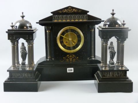 A Victorian black slate clock garniture, architectural temple style clock, twin wind movement with spring gong, the dial with Roman numerals flanked by Corinthian capped columns, the garniture pieces in the form of dome topped temple structures supported by four Corinthian capped columns and centrally standing figures, the stepped bases with embossed figural front panels, 38 x 37 cms the clock
