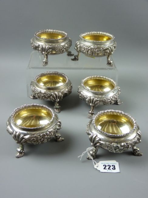 A set of six finely decorated silver circular salts (a set of four plus two) with raised floral decoration on four shell and claw supports, 47 ozs, various maker's marks, London 1872