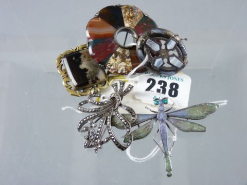 A multi agate circular brooch, an oval Celtic style brooch and another, a marcasite floral brooch and a sterling silver backed and enamel dragonfly brooch (parcel of five)