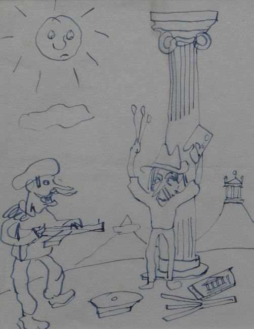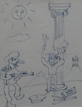 SIR KYFFIN WILLIAMS RA ink on paper - Grand Tour theme cartoon drawing with self-portrait, entitled 'Artistic Freedom', 17x 13cms Provenance: gifted by the artist to his friend Sir Alex Gordon
