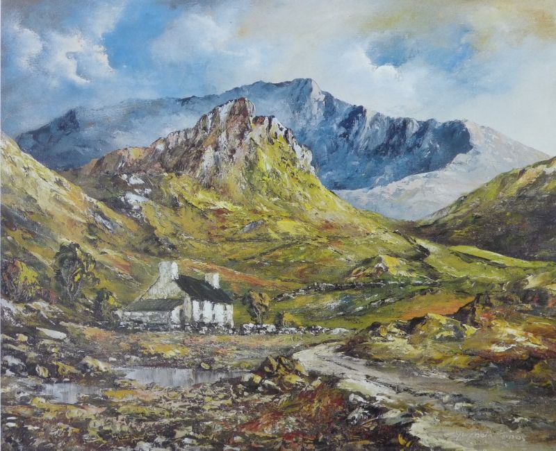 GWYNETH TOMOS coloured limited edition (67/130) print - Snowdon from Drws-y-Coed, signed, 21.5 x 26 cms and M B HUTT oil on board - contemporary sketch of the bridge at Aberffraw, Anglesey with children admiring ducks, 34 x 44 cms