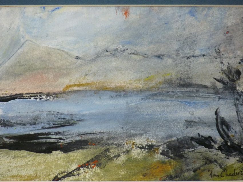 ANN CHADWICK mixed media - seascape with mountains beyond, signed, 11.5 x 18 cms