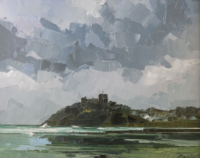 DAVID GROSVENOR oil on canvas - Criccieth Castle, signed and with original Tegfryn Gallery label verso, 39.5 x 39.5 cms