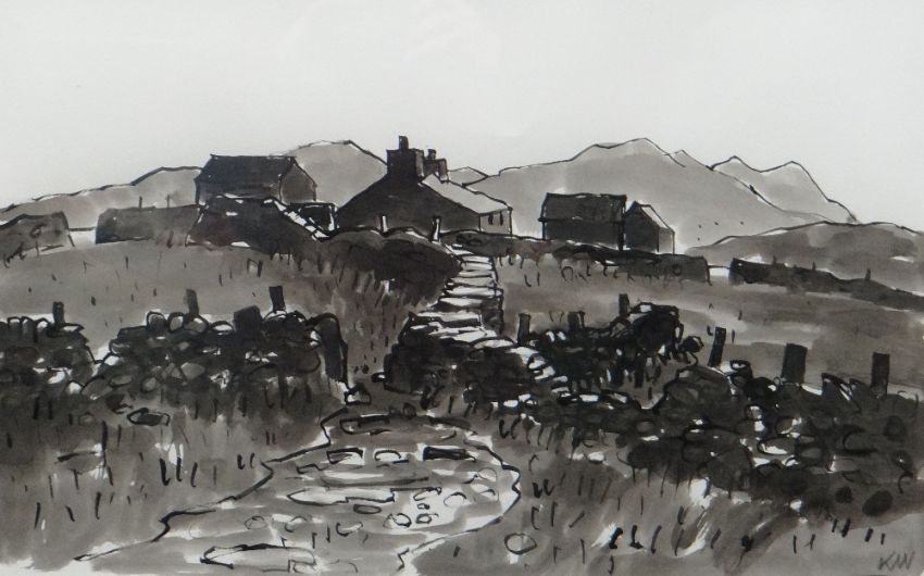 SIR KYFFIN WILLIAMS RA colourwash - upland cottages and dry-stone walls near Caernarfon, entitled 'Farm at Cesarea', signed, 35 x 55cms