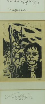 SIR KYFFIN WILLIAMS RA woodcut - boys and pigs from the Mabinogion, signed with initials and with handwritten greeting from the artist 'Penblwydd Hapus, Kyffin', 19 x 20 cms