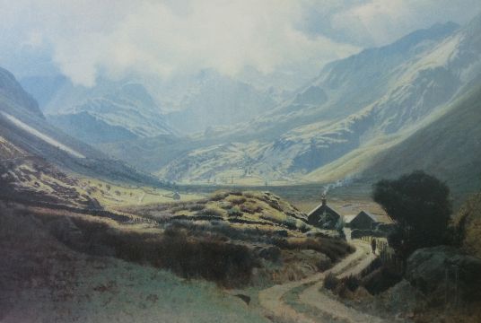 DAVID WOODFORD atmospheric etching - street scene, Bethesda with figures on a back lane, signed and entitled 'Bethesda Roofs', 21 x 45 cms and DAVID WOODFORD coloured limited edition (416/1000) print - Ogwen Valley with farmer on a track, signed, 33 x 49 cms