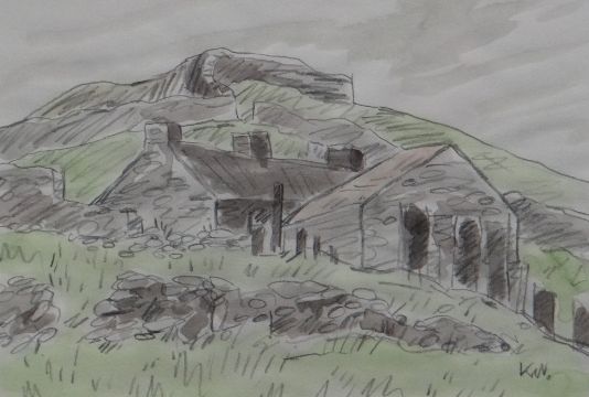 SIR KYFFIN WILLIAMS RA watercolour and pencil - upland farm and winding dry-stone wall, signed, 20 x 29cms