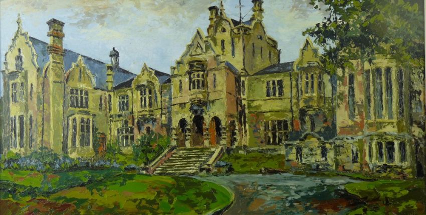 ROWENA WYN oil on board - a fine study of the Normal College, Bangor, signed and with original artist's address label verso, 40 x 75 cms (Provenance: vendor's grandfather was Mr Edward Rees, Principal of the Normal College circa 1956-1966, the painting having been presented to him by staff on the occasion of his retirement)