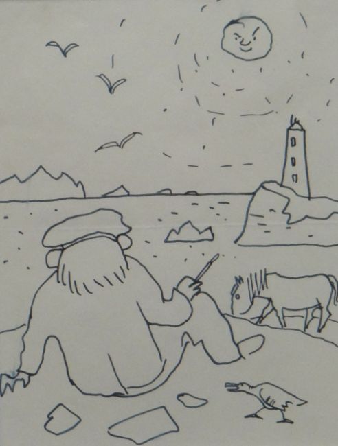 SIR KYFFIN WILLIAMS RA ink on paper - caricature drawing self-portrait working 'en plein air', inscribed verso 'Painting at Llanddwyn 1955', 17x 13cms Provenance: gifted by the artist to his friend Sir Alex Gordon