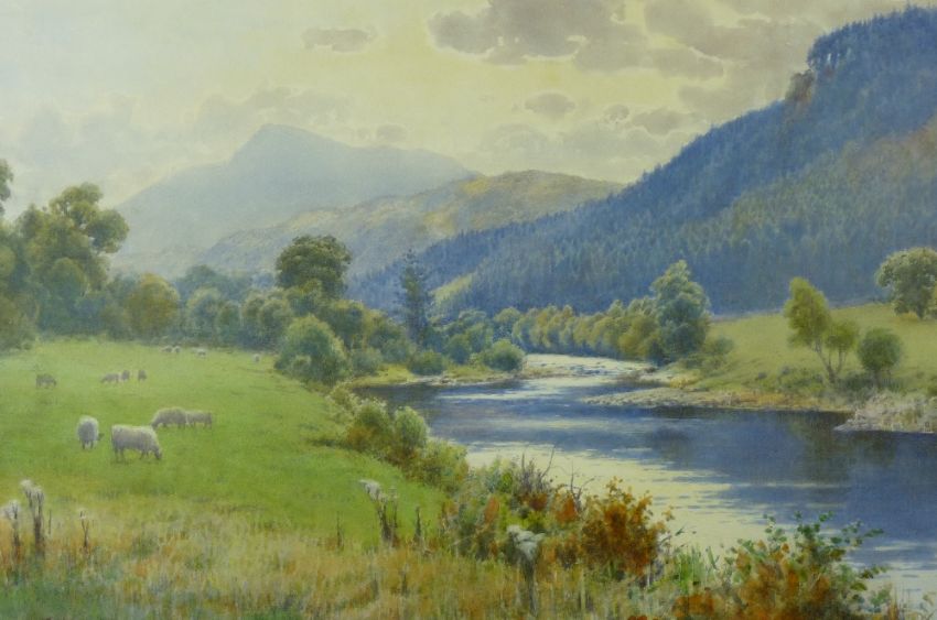 WARREN WILLIAMS ARCA watercolour - River Conwy with grazing sheep and Moel Siabod in the distance, signed, 36 x 61 cms