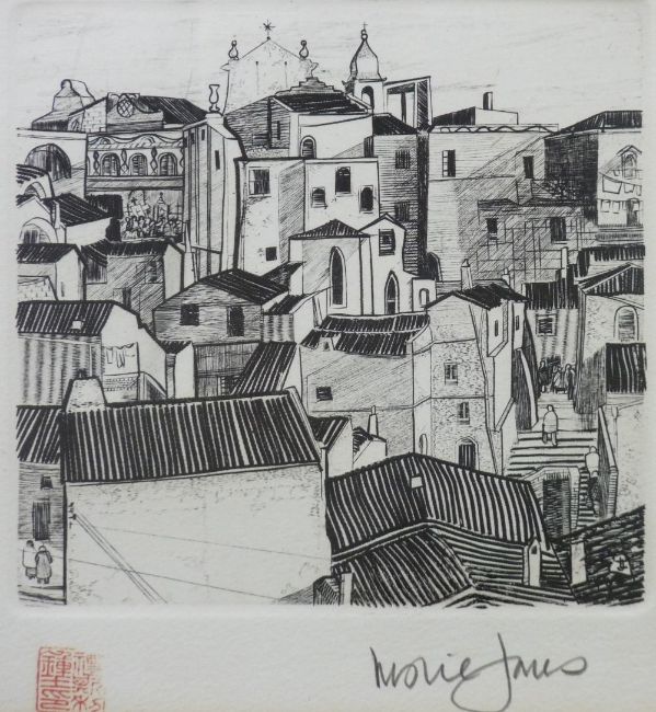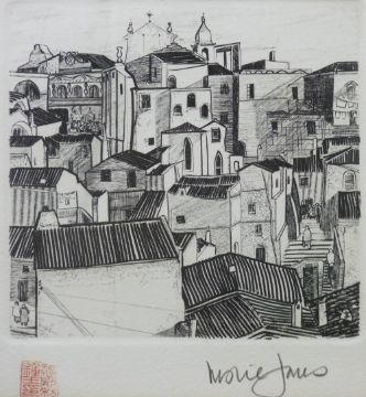 LESLIE JONES black and white print - Italian rooftops with figures on steps, signed, 15 x 15 cms