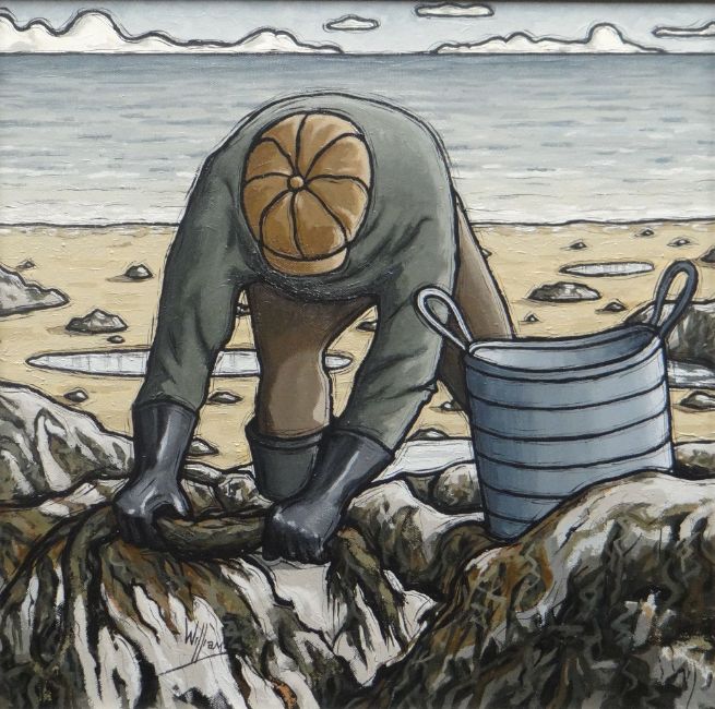 ALAN (EA) WILLIAMS acrylic on canvas - figure bent over with back to the shore, entitled 'Seaweed Gatherer', signed, 50 x 50cms
