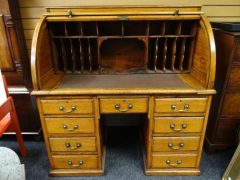 A good vintage oak roll-top desk with a pair of pedestals of four drawers to flank a single centre drawer, all supporting a quarter-cylinder tambour-hood rolling to reveal the well-fitted pigeon-hole interior, 130cms wide