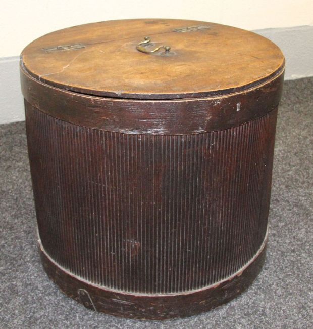 A nineteenth century cylindrical hat-box, having a corrugated outer wall and hinged lid with brass handle and hinges, partially lined with 1819 newspaper, 51cms diam