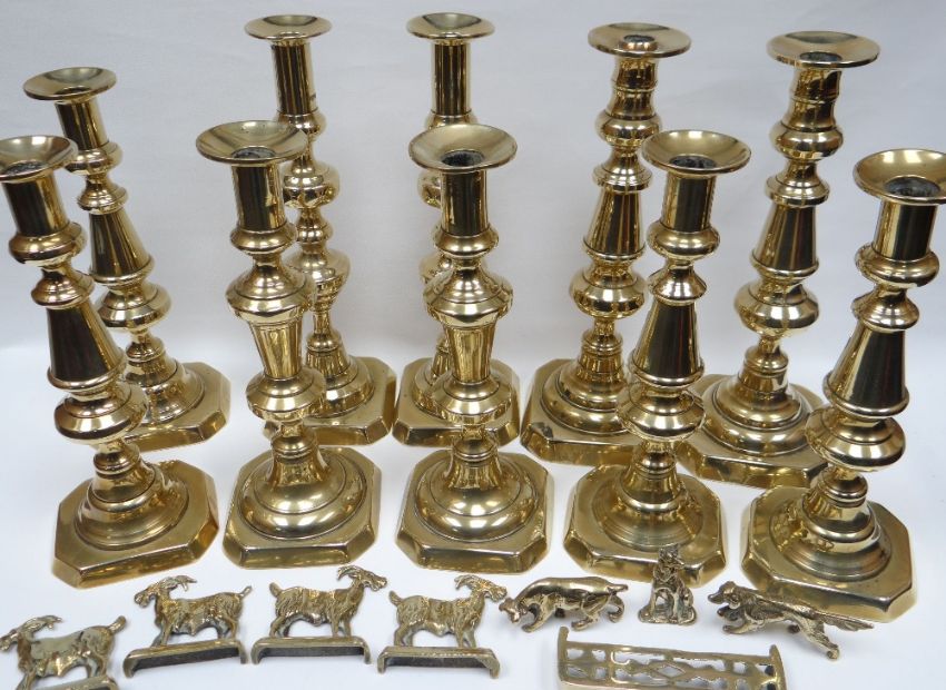 Two trios and two pairs (10) antique brass candle-holders, various sizes; four miniature brass goat models etc