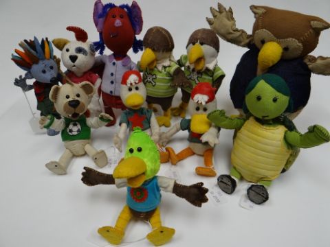 By direction from the renown Welsh animators Calon TV: Eleven original animation puppets from the BAFTA award winning series 'Hana's Helpline'. Each puppet is hand-stitched over a fully-articulated skeleton (known as an armature). Each puppet is able to move to the smallest detail by means of hinge-and-ball socket-joints, this enabling the frame by frame animation effect which is filmed. The puppets were designed by Beka D'Aborn and constructed at Calon TV's Cardiff studios. Hana's Helpline was a hugely popular 52 episode stop-motion animation series for small children , the stories based around Hana, a duck, who runs a telephone helpline for animals with problems. It was first broadcast under the Welsh title Holi Hana, on April 2 2007 and subsequently translated for English broadcast and overseas.