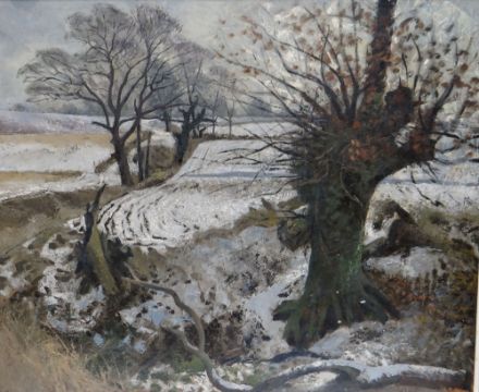 JOHN ALDRIDGE (1905-1984) oil on board - British landscape in winter with trees, signed and dated March '55, 64 x 79cms