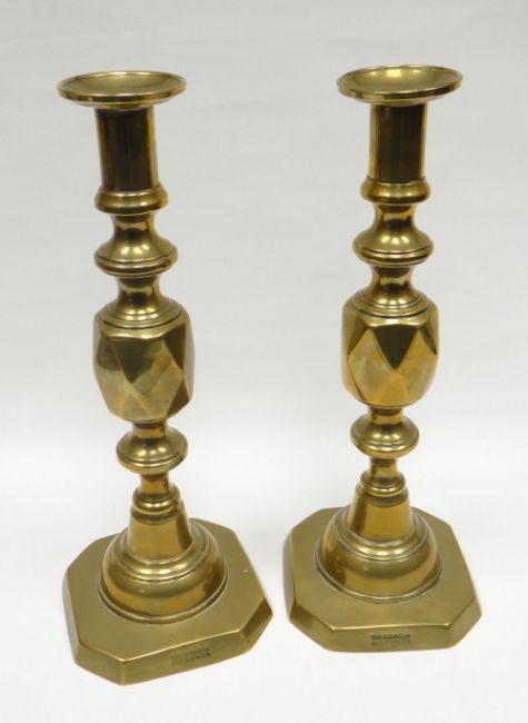 A pair of brass candle-holders 'THE QUEEN OF DIAMONDS', 29cms high