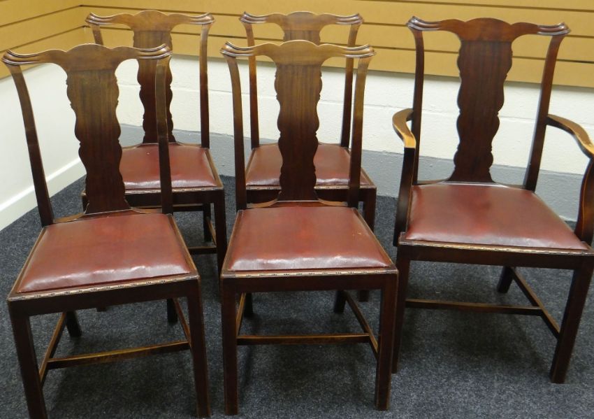 A set of five (4+1) mahogany dining chairs with shaped slats, shaped rails and drop-in seats