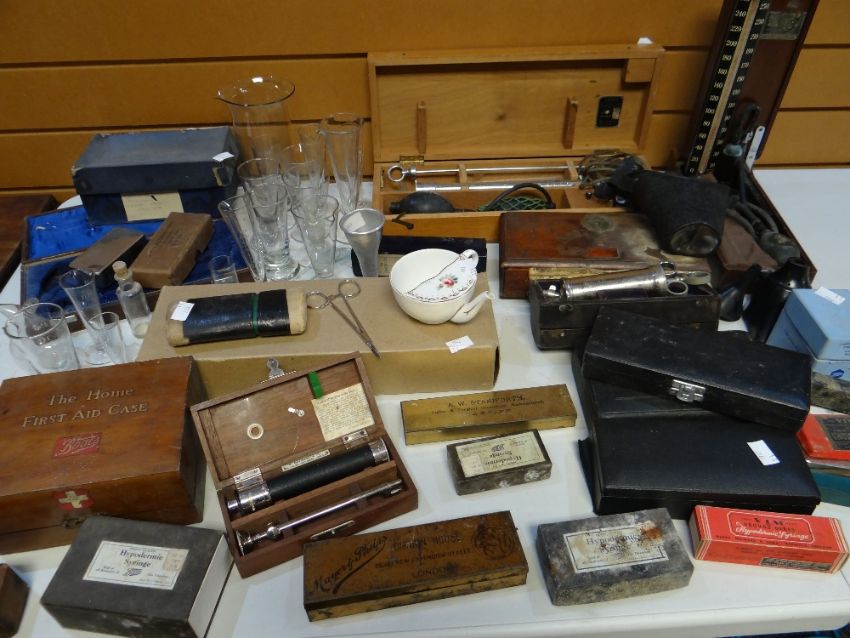 A large collection of mixed vintage medical profession items and accessories, including glassware, cased blood-pressure monitor etc (from the ownership of a late country GP practicing in the Carmarthenshire area)