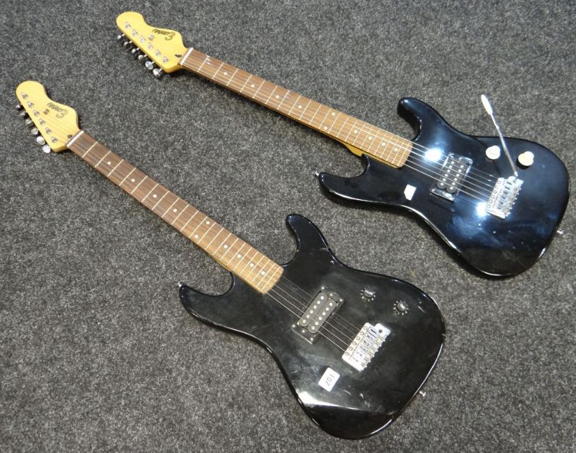Two child-size black Encore electric guitars