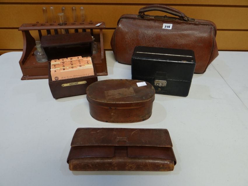 Sundry GP items including a Gladstone-type Doctor-on-call leather bag, a dispensary glasses stand, a Bakelite index-card holder etc (from the ownership of a late country GP practicing in the Carmarthenshire area)