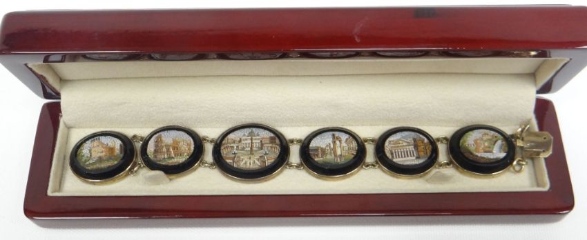 A fine 19th century-mosaic 'Grand Tour' bracelet composed of six oval tablets with romantic scenes of Ancient Rome, in gold frames and links, 19 cms