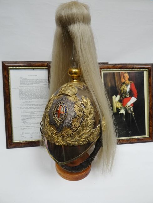 A Life Guards officer's parade helmet with plate, plumage, chinscale strap and liner, accompanied by framed documentation attributing the helmet to 2nd Lieut H. St. George, Killed In Action 15.11.1914