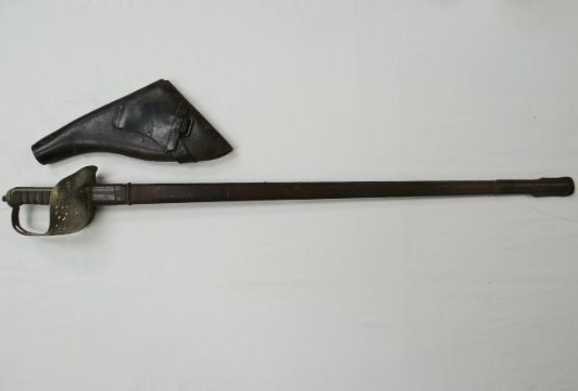 A George V officer's sword in leather scabbard together with a leather pistol holster date stamped 1917
