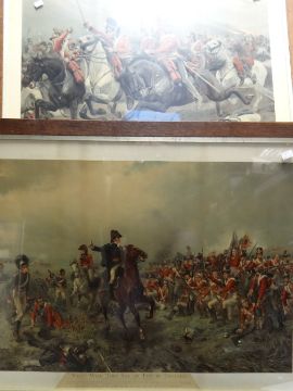 Two large framed prints depicting the charge of the Union Brigade at Waterloo and Wellington and his troops at Waterloo