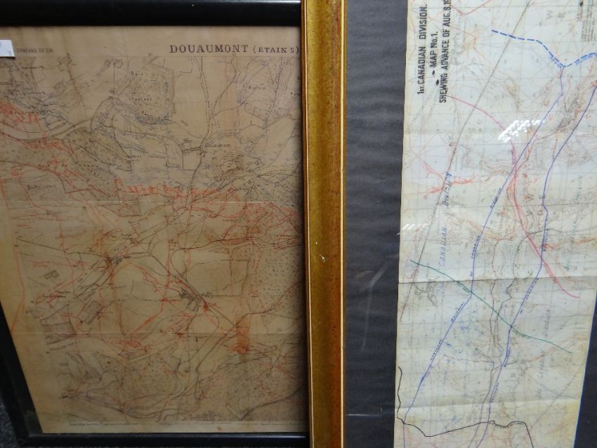 Two framed WWI trench maps, one marked '1st Canadian Division Map No.1 Shewing Advance of Aug 8 1918'