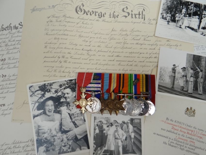 Group of 9 medals to Lt. Col. J.C. Lambkin, R.A.M.C. consisting of: The Most Excellent Order of the British Empire, O.B.E. (Military) Officer's 2nd type breast badge, silver-gilt; General Service 1918-62, 3 clasps, Palestine, Palestine 1945-48, Malaya, M.I.D. oak leaf (Capt., R.A.M.C.); 1939-45 Star; Africa Star; Burma Star; Defence and War Medals, M.I.D. oak leaf; Africa General Service 1902-56, 1 clasp, Kenya (Lt. Col., R.A.M.C.); Coronation 1953. Sold with O.B.E. bestowal document and accompanying letter; paper cutting concerning the award; M.I.D. certificate, 7. January 1949; commission document for Lieutenant, 1937; three wedding photographs and a letter of condolence from the Central Chancery, dated 19 January 1983. O.B.E. for service in Kenya during the Mau-Mau rebellion, London Gazette 28 August 1956: 'For distinguished service and devotion to duty as Officer Commanding the British Military Hospital, Nairobi, since December, 1954'. M.I.D. London Gazette 7 January 1949. 'in recognition of gallant and distinguished services in Palestine during the period 27th March,1948 to 30th June, 1948'. John Charles Lambkin was born in Hong Kong on 21 November 1912, entering the Army as a Lieutenant, and was promoted to Captain in January 1939. Appointed an Acting Major in June 1941 and Temporary Major, September 1941-December 1943, he became a war substantive Major in December 1943 and was promoted to Lieutenant-Colonel in November 1952 and Acting Brigadier, January-February 1960
