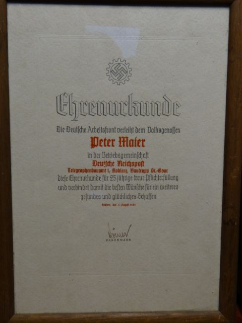 A framed 25 Year's German Third Reich D.A.F. service award dated 1941