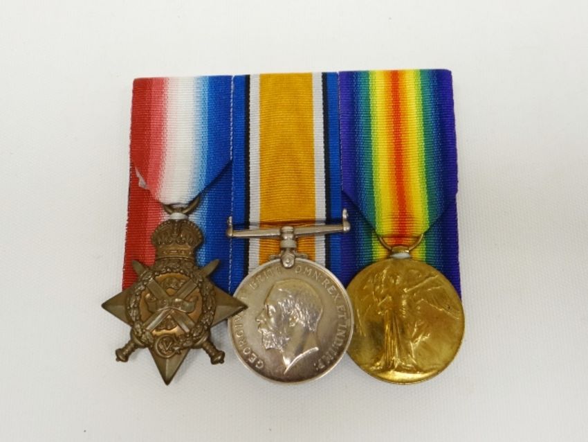 A WWI 1914 trio of medals to 10582 Pte. W. Green, Notts. & Derby R. With copy paperwork listing Green as 'P.O.W.'