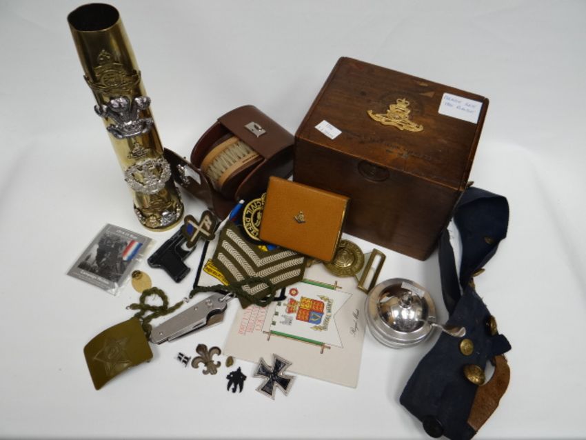 An artillery shell crested with regimental insignia together with an EPNS sugar cellar with RAF engraving, Royal Artillery crested leather cigarette holder and wooden box, leather cased uniform brushes, cloth patches, reproduction Iron Cross etc.