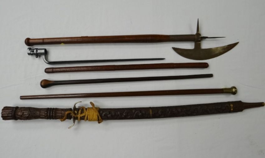 Two wooden swagger sticks, another leather together with three reproduction edged weapons