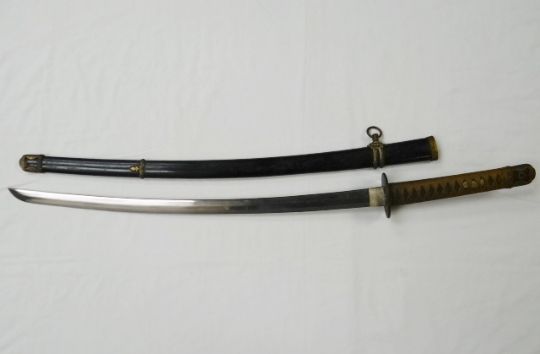 A good WWII Japanese Naval katana with anchor arsenal mark on tang, with black and gilt decorative saya, metal tsuba and matching foliate furniture around bound grip