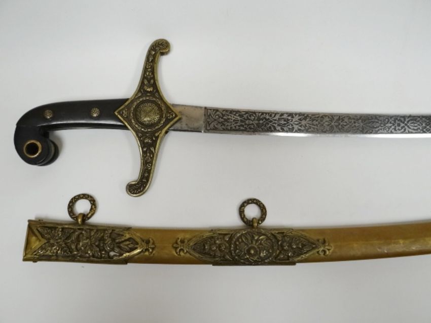 A Mameluke-style British sword with Arabic engravings dated 1895 and decorative shamrock, thistle and rose decoration