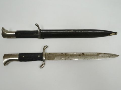 A German dress bayonet by E. Pack & Sohne, Solingen in scabbard marked Berg & Co. together with another similar without scabbard