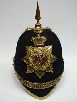 A blue cloth helmet with yellow metal fittings and lining marked 'Humphries & Crook, Haymarket, London SW'
