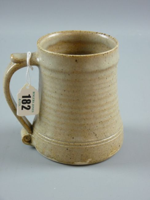 A St Ives pottery tankard in oatmeal glaze, ribbed body and scroll handle, 12.5 cms high