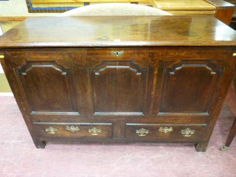 An 18th Century oak Lancashire style mule chest, well patinated with three front shaped and fielded panels, crossbanded verticals and edging over two opening crossbanded base drawers with original pierced brass backplates and escutcheons with swan neck handles, 93 x 144 cms
