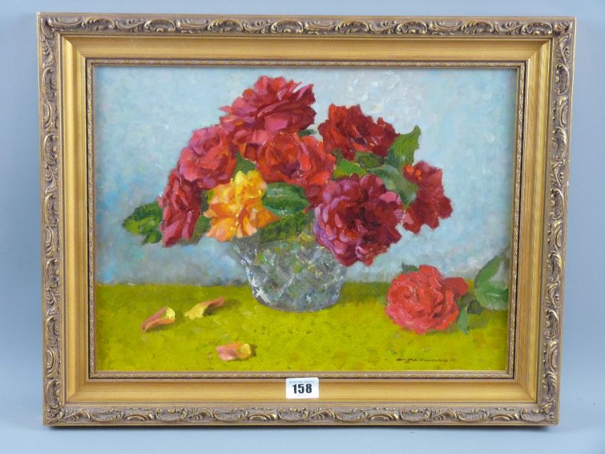 ARTHUR HAYWARD oil on board - still life, roses in a vase, signed and with title label verso with artist's address and original price, 29 x 39 cms