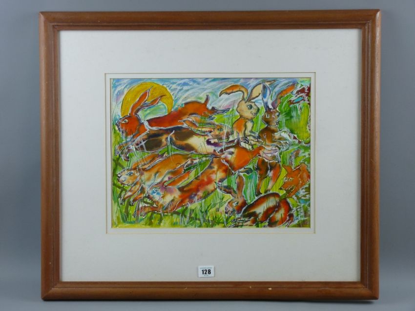 JENNIFER MARY DODD watercolour/mixed media - large group of hares being chased by a fox, signed and titled and dated verso 'Run Rabbit Run, 2005', 30 x 39.5 cms