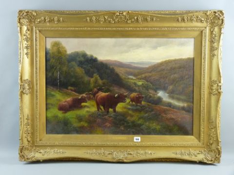 HENRY ROBINSON HALL oil on canvas - seven Highland Cattle on a wooded bank above a river valley, signed and entitled canvas verso 'Highland Cattle, River Glass, Inverness-shire, 49 x 75 cms