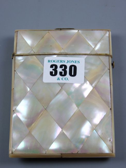 A mother of pearl card case with end hinged lid and silver mounted lid