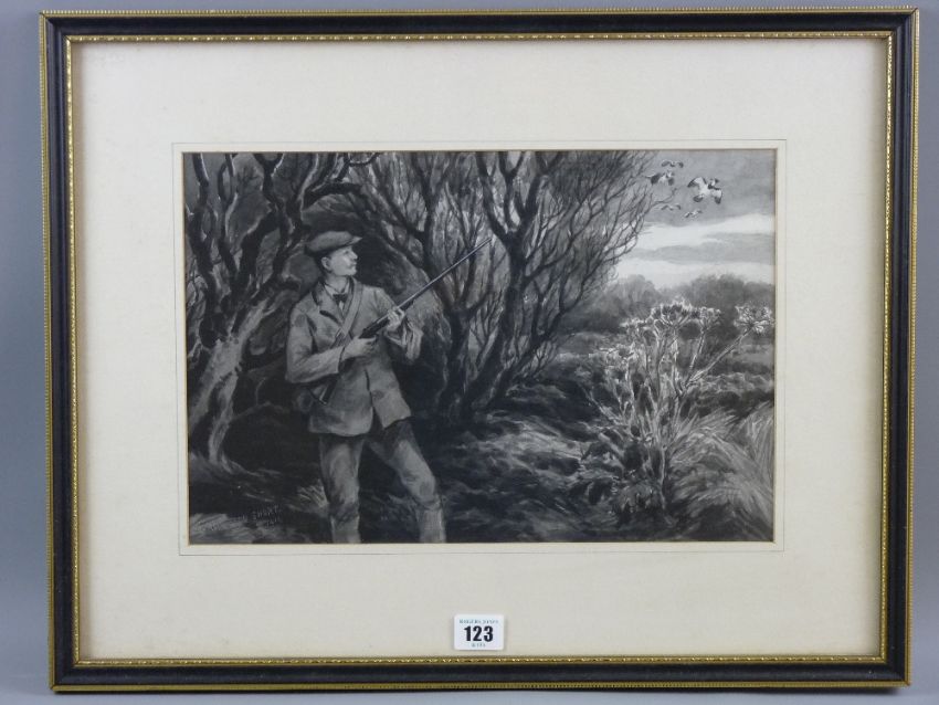 GEORGE ANDERSON SHORT watercolour - huntsman by a tree with gun at the ready, signed and dated 1914, 24 x 37 cms